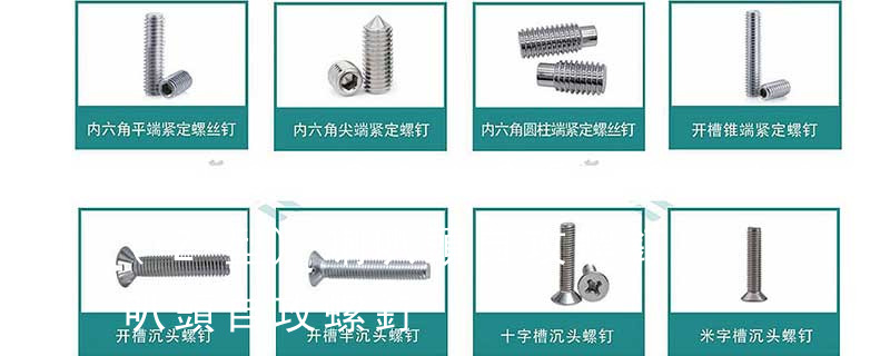 外扳擰:六角,六角法蘭面,六角凸緣,六角花形等;內扳擰:一字槽,十字槽H型,十字槽Z型,十字槽F型,四方槽,復合槽,內花鍵,內六角花形,內三角,內六角,內12角,離合器槽,六葉槽,高扭矩十字槽等。螺紋類型